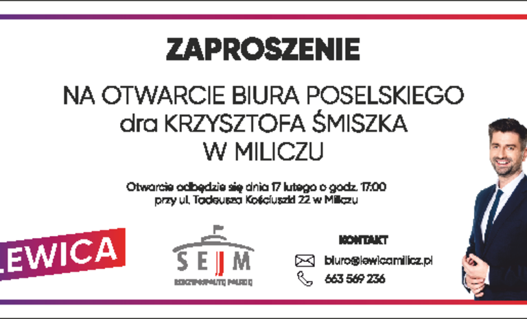 Zapraszamy na otwarcie biura poselskiego posła na sejm RP dr Krzysztofa Śmiszka w Miliczu. Uroczyste otwarcie i spotkanie z mieszkańcami rozpocznie się o godz. 17.00 przy ul. ...