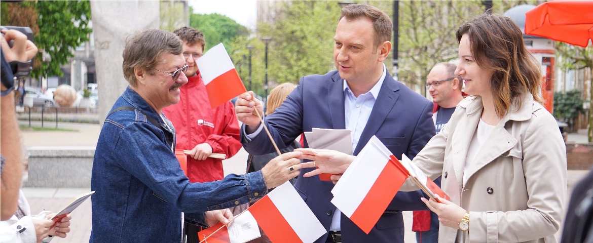 Politycy i działacze łódzkiego SLD uczcili Dzień Flagi, rozdając mieszkańcom i turystom spędzającym majówkę w Łodzi, flagi narodowe i egzemplarze Konstytucji RP.
